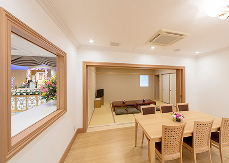 専用の親族控室も併設しております。ご自宅感覚でゆったりとくつろぎながら故人を囲み、心ゆくまでお別れの時間をお過ごしいただけます。